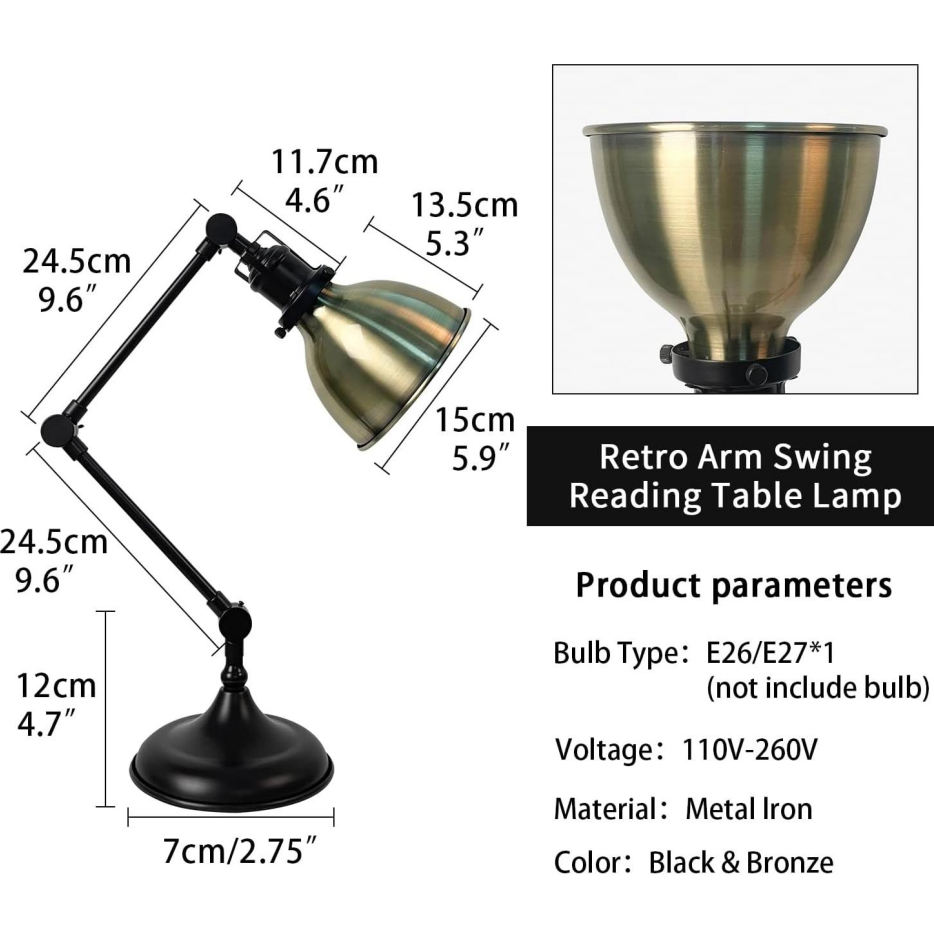 Industrial Style Desk Lamp – Adjustable metal swing arm, E26 base, vintage brass
