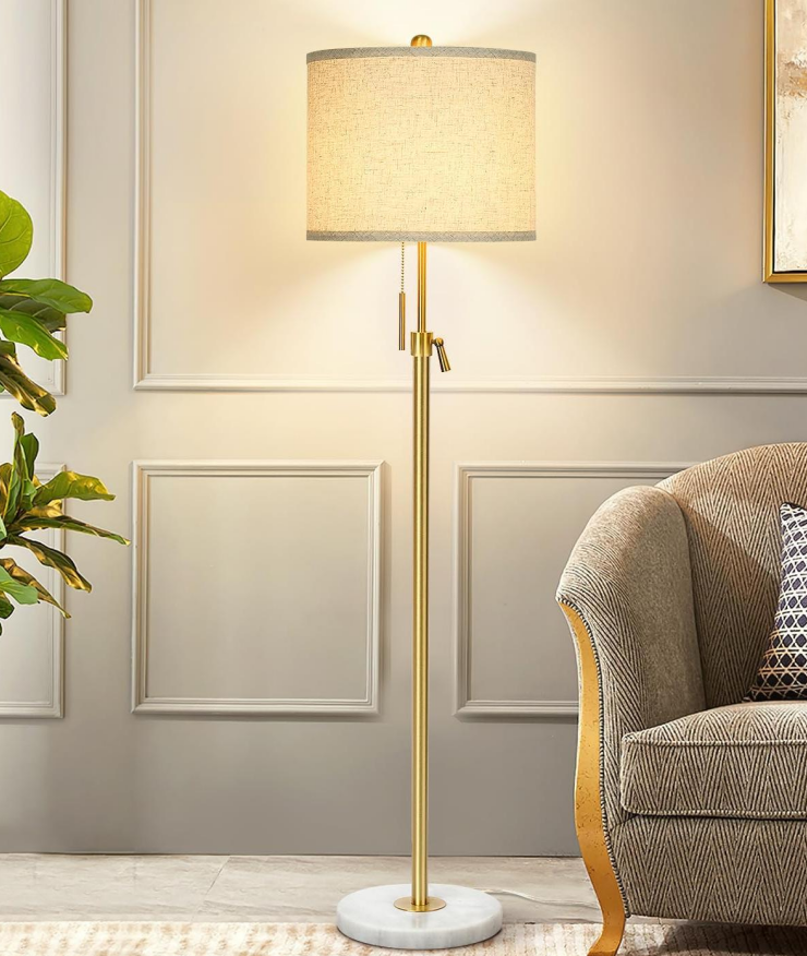 - Modern Floor Lamp: The floor lamps adopts gold metal lamp pole and white marble base, overall body golden presents a fashion look. With the linen lampshade, the floor lamp presents a elegant appearance. It is a good domestic adornment for your living room, bedroom, or study room. (Note: The shades need to be assembled)